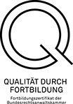 Die Rechtsprechung entwickelt sich rasant. Um sicherzustellen, dass ich in den von mir angebotenen Beratungsfeldern immer auf dem neuesten Stand bin, bilde ich mich regelmäßig fort. Ich bin Inhaber des Fortbildungszertifikates der Bundesrechtsanwaltskammer (BRAK) sowie der Fortbildungsbescheinigung des Deutschen Anwaltvereins (DAV) e.V.